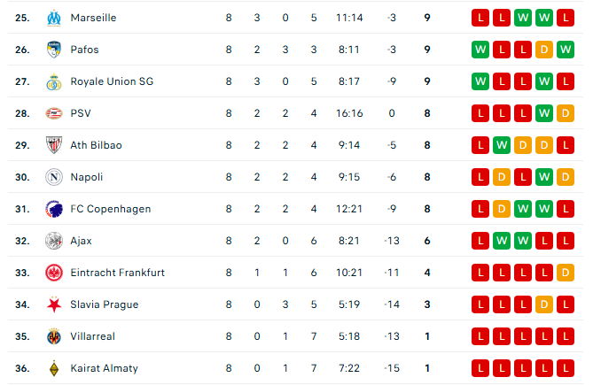 Përveç Napolit, nga Liga e Kampionëve u eliminuan edhe Marseille, Pafos, Royale Union SG, PSV, Athletic Bilbao, Copenhagen, Ajax, Eintracht Frankfurt, Slavia Prague, Villarreal dhe Kairat Almaty.