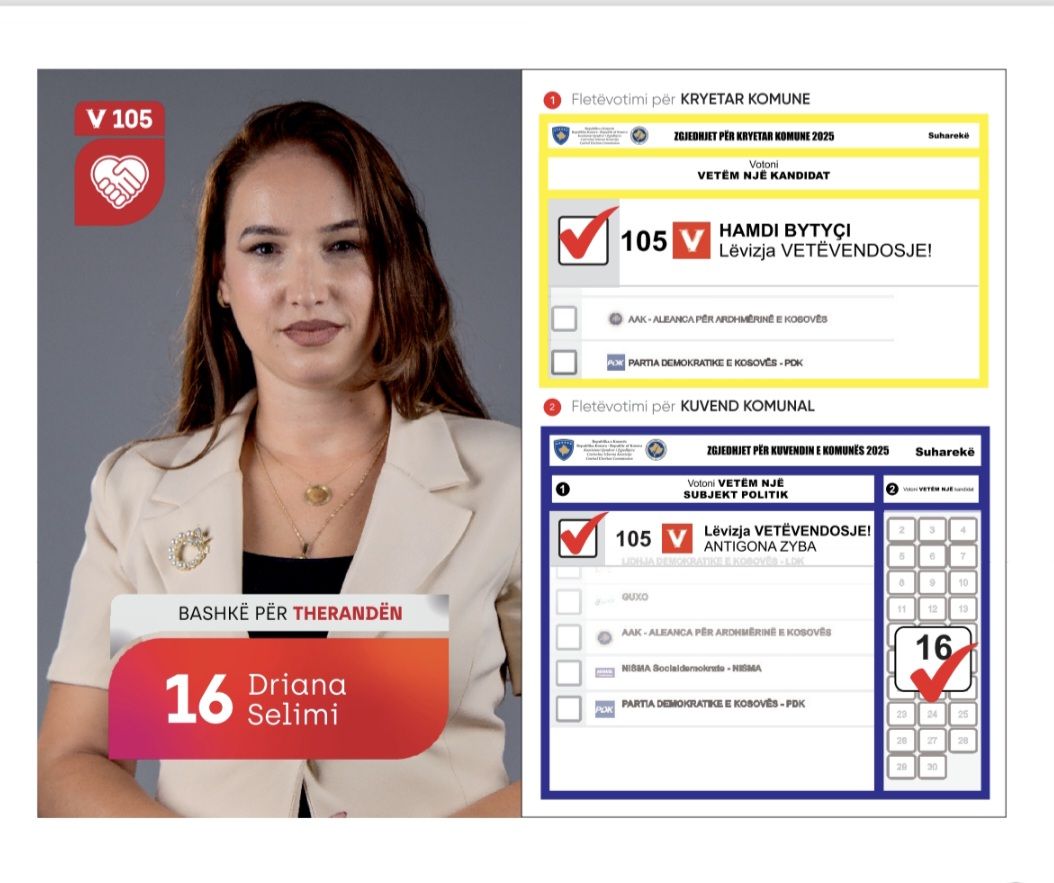 Vetëm një ditë para zgjedhjeve lokale, kandidatja për Asamblenë Komunale të Suharekës nga radhët e Lëvizjes Vetëvendosje, Driana Elshani Selimi, ka bërë thirrje për mobilizim dhe mbështetje për vizionin që ajo përfaqëson.