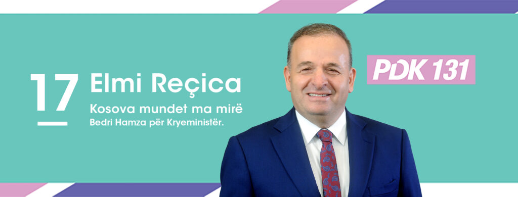 Kandidati për deputet nga radhët e PDK-së. Elmi Reçica i cili garon me numrin 17 në listën zgjedhore të PDK-së, së bashku me kandidaten për deputete Mimoza Sojeva Pajazitin kanë takuar qytetarë të shumtë ferizajas. Reçica dhe Mimoza Sojeva Pajaziti janë ndarë të kënaqur me entuziazmin dhe përkrahjen e qytetarëve për vizionin e Partisë Demokratike të Kosovës dhe kryeministrit në ardhje, Bedri Hamza. Bashkë për një Kosovë më të mirë, më të zhvilluar dhe më të fortë!.