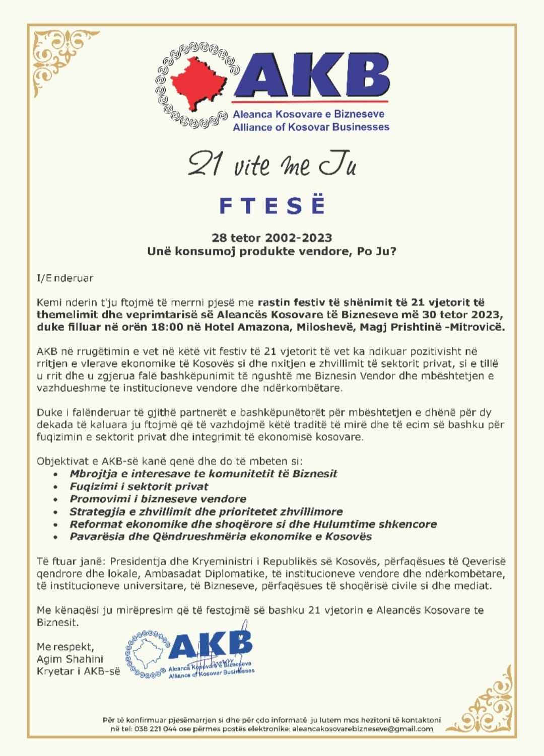 Ju ftojmë të merrni pjesë në festën e 21 vjetorit të themelimit dhe veprimtarisë së Aleancës Kosovare të Bizneseve me 30 tetor 2023 në orën 18:00 në Hotel Restaurant Amazona, Milloshevë.