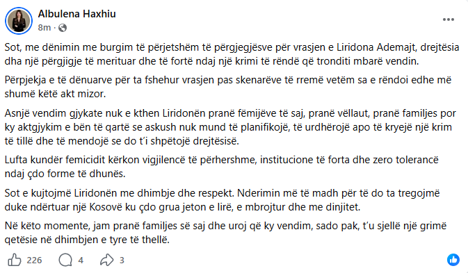 “Sot, me dënimin me burgim të përjetshëm të përgjegjësve për vrasjen e Liridona Ademajt, drejtësia dha një përgjigje të merituar dhe të fortë ndaj një krimi të rëndë që tronditi mbarë vendin. Përpjekja e të dënuarve për ta fshehur vrasjen pas skenarëve të rremë vetëm sa e rëndoi edhe më shumë këtë akt mizor. Asnjë vendim gjykate nuk e kthen Liridonën pranë fëmijëve të saj, pranë vëllait, pranë familjes por ky aktgjykim e bën të qartë se askush nuk mund të planifikojë, të urdhërojë apo të kryejë një krim të tillë dhe të mendojë se do t’i shpëtojë drejtësisë”, ka shkruar ajo në “Facebook”.
