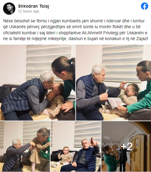 “Nëse besohet se fëmiu i ngjan kumbarës jam shumë i nderuar dhe i lumtur që Uskanës përveç përzgjedhjes së emrit sonte iu morën flokët dhe u bë oficialisht kumbar i saj lideri i shqiptarëve Ali Ahmeti! Privilegj për Uskanën e ne si familje të ndjejmë mirëpritje, dashuri e bujari në konakun e tij në Zajaz!”, ka shkruar Shkodran Tolaj në “Facebook”.