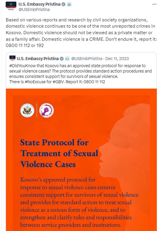 Ambasada e Shteteve të Bashkuara të Amerikës, përmes një postimi në platformën ‘X’, ka reaguar pas raporteve dhe hulumtimeve të organizatave të shoqërisë civile, sipas të cilave dhuna në familje është ndër krimet më të paraportuara në Kosovë.