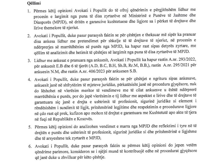 Institucioni i Avokatit të Popullit ka dalë me vendim lidhur me shkarkimin e një numri të madh të zyrtarëve të Ministrisë së Punëve të Jashtme dhe Diasporës, duke konstatuar se ata janë larguar pa u respektuar ligji, fryma e ligjit dhe siguria juridike.
