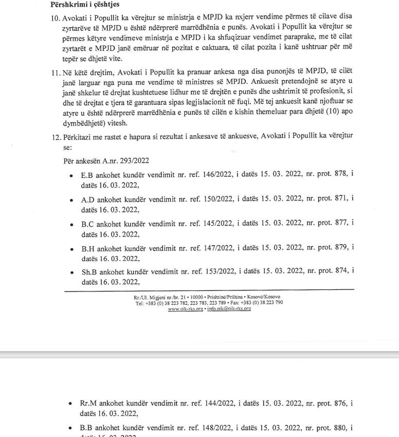 Bëhet fjalë për ankesat e tetë zyrtarëve të cilët janë larguar nga puna në Ministrinë që drejton ministrja Donika Gërvalla Schwarz.