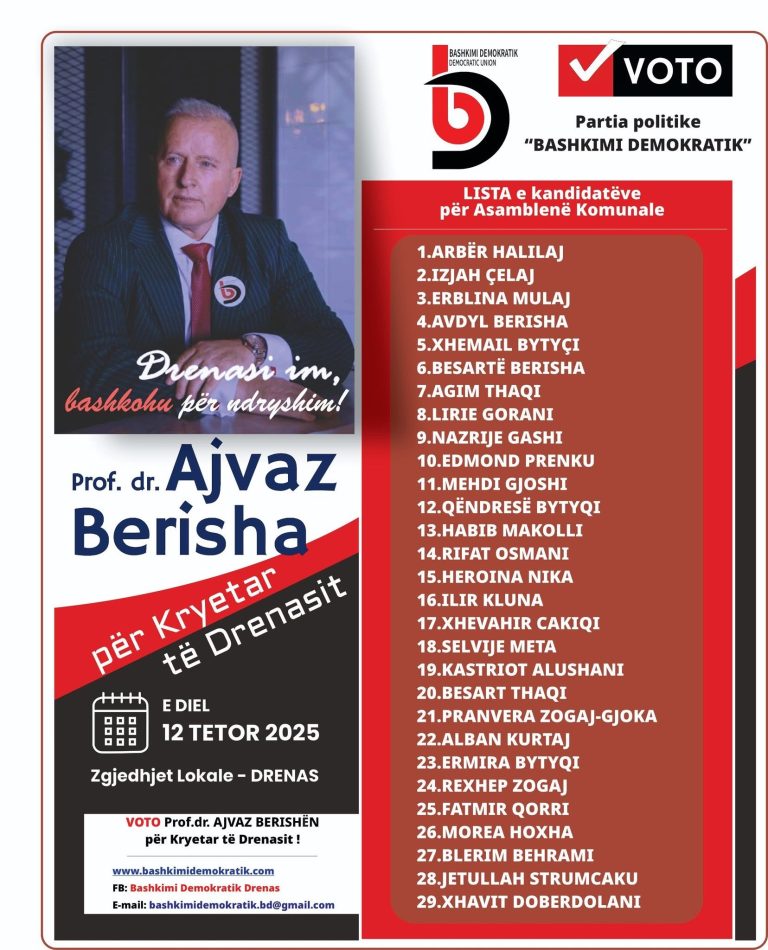 Partia politike, Bashkimi Demokratik që drejtohet nga Prof. Ajvaz Berisha do të garojë me numrin 145 në zgjedhjet e 12 tetorit. Kjo parti do të garoj vetëm në komunën e Drenasit dhe në listën zgjedhore ka 29 kandidatë për asamblistë të Drenasit.