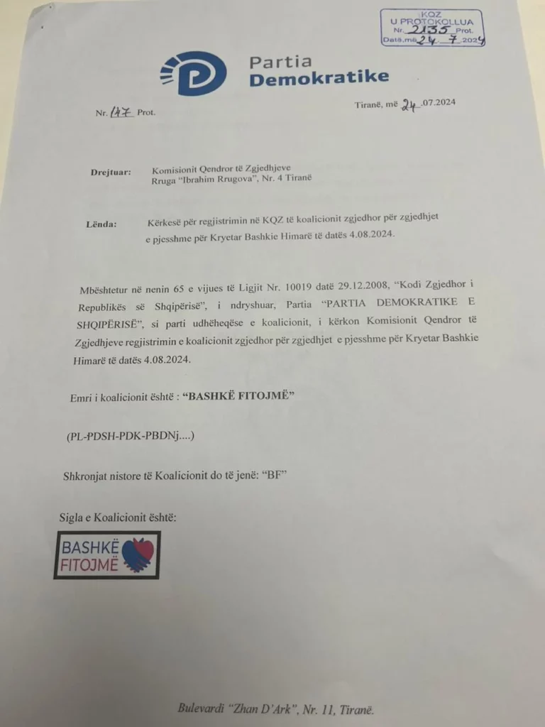 Partia Demokratike ka bërë kërkesë në KQZ për regjistrimin e koalicionit për zgjedhjet e Himarës, që do të mbahen më datë 4 gusht. Ky koalicion mban emrin “Bashkë Fitojmë” dhe përfshinë partitë PL, PDSH, PDK, PBDNJ, duke bërë bashkë kështu Berishën, Ilir Metën, Vangjel Dulen dhe Nard Ndokën.