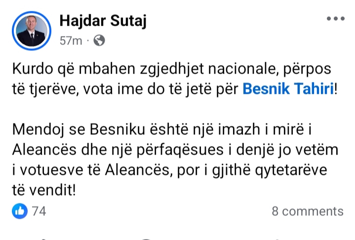 “Kurdo që mbahen zgjedhjet nacionale, përpos të tjerëve, vota ime do të jetë për Besnik Tahiri. Mendoj se Besniku është një imazh i mirë i Aleancës dhe një përfaqësues i denjë jo vetëm i votuesve të Aleancës, por i gjithë qytetarëve të vendit!”, ka shkruar Sutaj në ‘Facebook’.