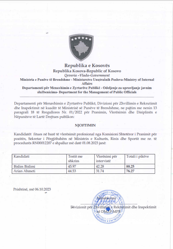 Ministria e Kulturës, Rinisë dhe Sportit është bërë me Sekretar të ri. Bislim Bislimi, do ta ushtrojë këtë pozitë tash e tutje. Ai ishte në garë me Arian Ahmetin.