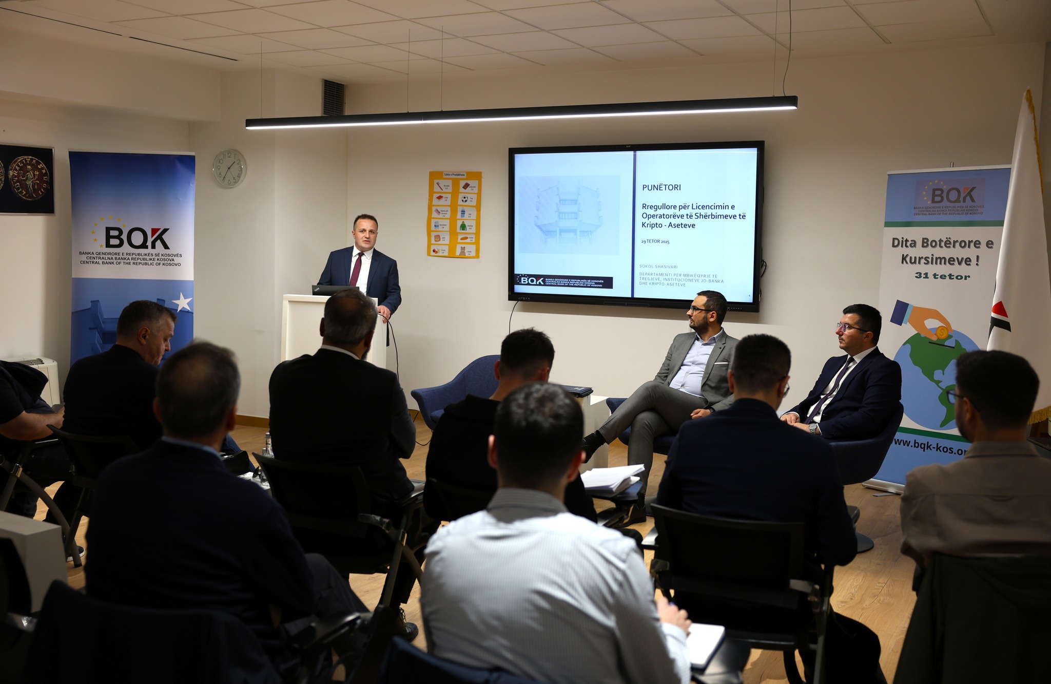 Banka Qendrore e Republikës së Kosovës (BQK) ka organizuar punëtorinë informuese me pjesëmarrjen e përfaqësuesve të institucioneve dhe palëve të interesit në fushën e kripto-aseteve, me fokus prezantimin e kornizës rregullative për licencimin e operatorëve të shërbimeve të kripto-aseteve me aktivitet këmbimi.