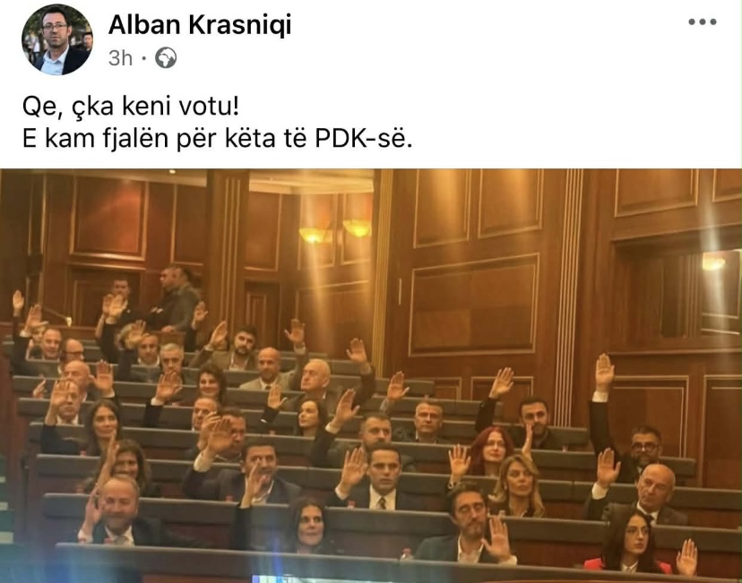 “Qe, çka keni votu. E kam fjalën për këta të PDK-së”, shkroi Krasniqi.