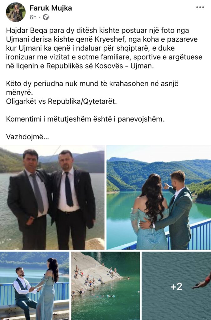 “Hajdar Beqa para dy ditësh kishte postuar një foto nga Ujmani derisa kishte qenë Kryeshef, nga koha e pazareve kur Ujmani ka qenë i ndaluar për shqiptarë, e duke ironizuar me vizitat e sotme familiare, sportive e argëtuese në liqenin e Republikës së Kosovës – Ujman.