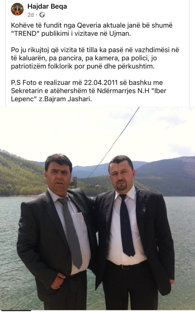 Ditë më parë ish-kryeshefi i “Iber Lepencit”, Hajdar Beqa ka postuar një fotografi të realizuar në vitin 2011 ku kishte vizituar Liqenin e Ujmanit. Beqa ka shkruar në llogarinë e vet për këtë vizitë ku kishte krahasuar me vizitat e ditëve të sotit të qytetarëve dhe qeveritarëve aktual.
