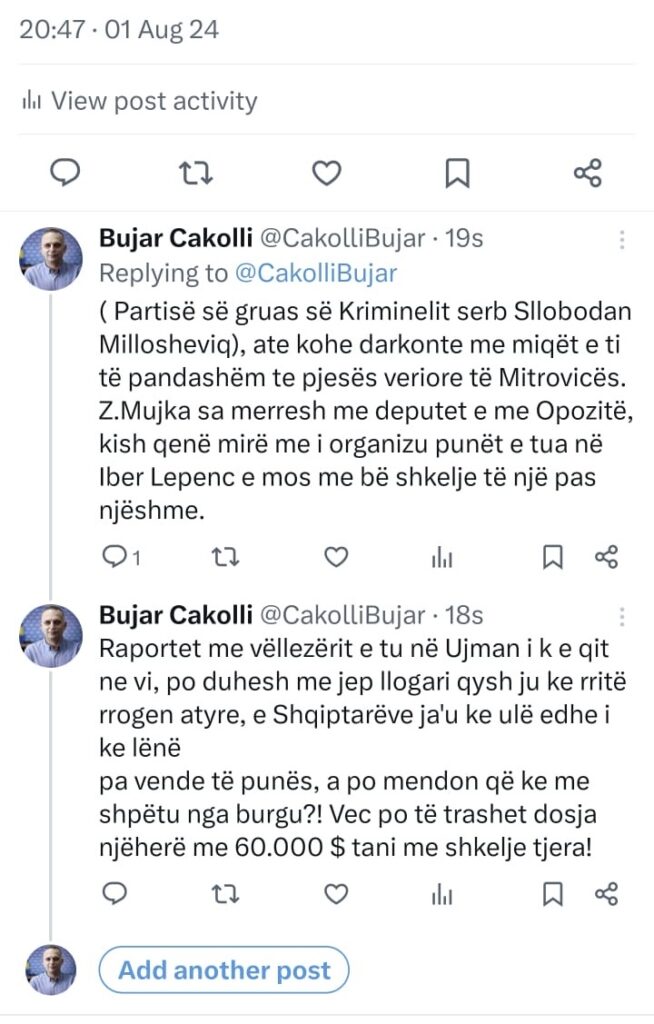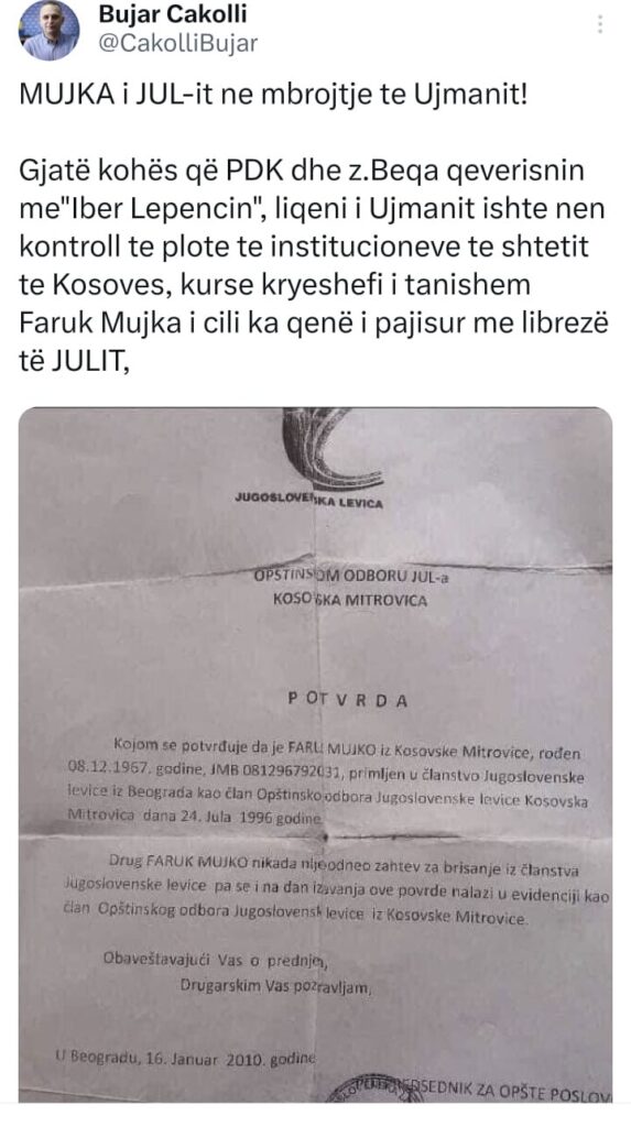 “Gjatë kohës që PDK dhe z.Beqa qeverisnin me “Iber Lepencin”, liqeni i Ujmanit ishte nën kontroll të plotë të institucioneve të shtetit të Kosovës, kurse kryeshefi i tanishëm Faruk Mujka i cili ka qenë i pajisur me librezë të JULIT (Partisë së gruas së Kriminelit serb Sllobodan Millosheviq), ate kohe darkonte me miqët e tij të pandashëm të pjesës veriore të Mitrovicës”, ka shkruar Bujar Cakolli.