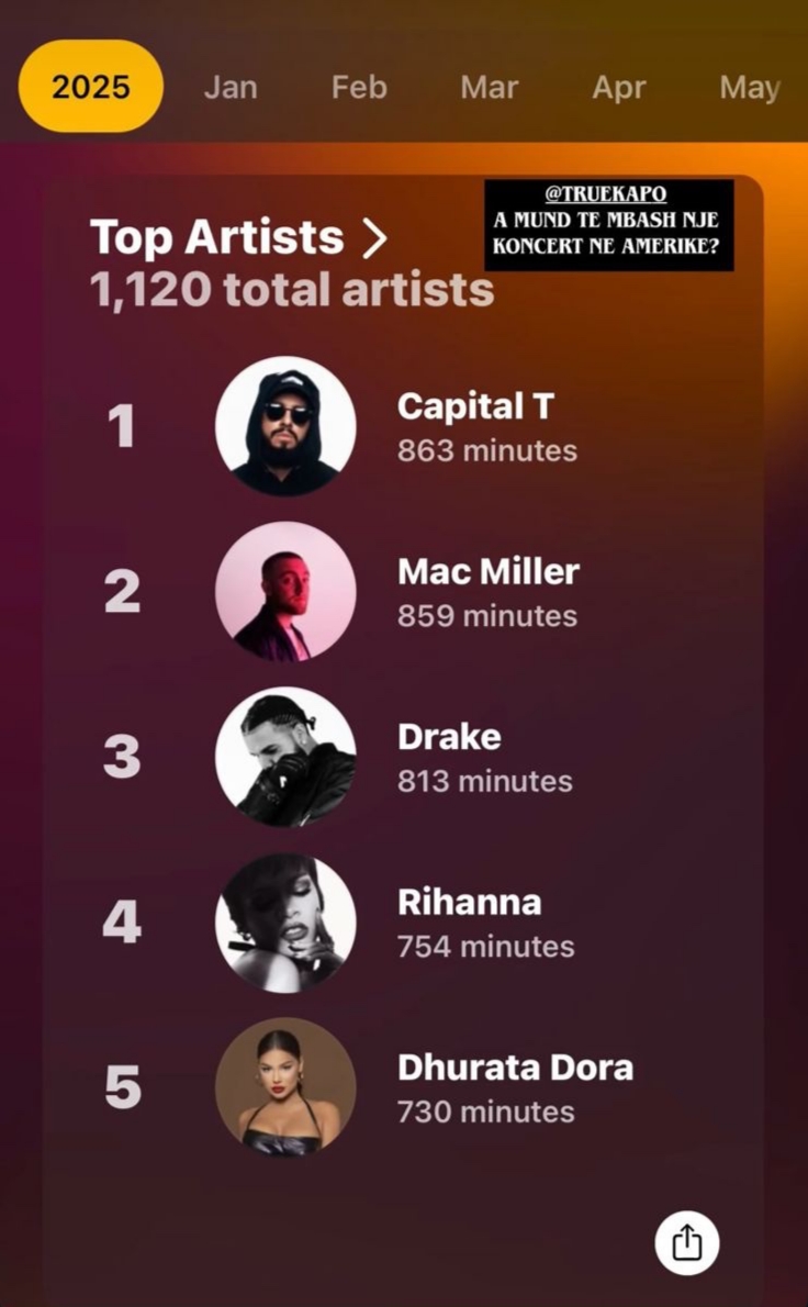 Sipas të dhënave të shpërndara, Capital T është dëgjuar për 863 minuta, duke lënë pas emra të mëdhenj të skenës botërore si Mac Miller, Drake, Rihanna dhe Dhurata Dora, të cilët gjithashtu shfaqen në pesëshen e artistëve më të dëgjuar, shkruan “Epoka e re”.