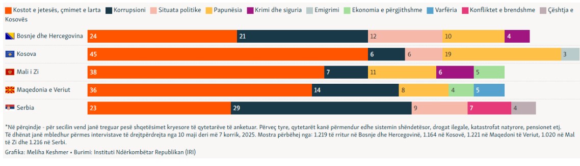 Qytetarët e Kosovës, Bosnje dhe Hercegovinës, Malit të Zi dhe Maqedonisë së Veriut më së shumti shqetësohen për kostot e jetesës dhe rritjen e çmimeve, pastaj për korrupsionin dhe situatën e përgjithshme politike.