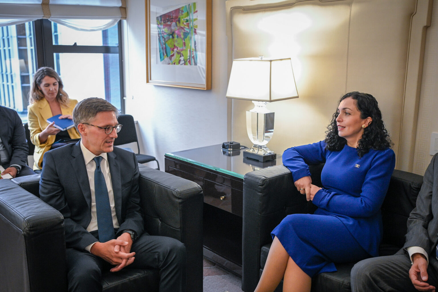 Këto takime të Osmanit me Escobar-in dhe Chollet-in, janë në kuadër të vizitës së saj në New York, ku është duke u mbajtur Sesioni i 78 i Asamblesë së Kombeve të Bashkuar.