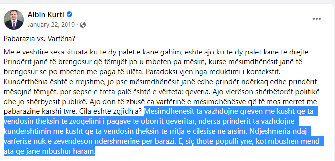 Kurti në një postim në “Facebook” në janar të vitit 2019 thoshte se mësuesit duhet ta vazhdojnë grevën me kusht që të vendosin theksin te zvogëlimi i pagave të oborrit qeveritar.