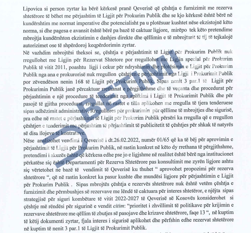 Ai tha se Prokuroria pretendon se Lipovica si person zyrtar, ka bërë kërkesë pranë Qeverisë që çështja e furnizimit me rezerva shtetërore të bëhet me përjashtim të Ligjit për Prokurim Publik.