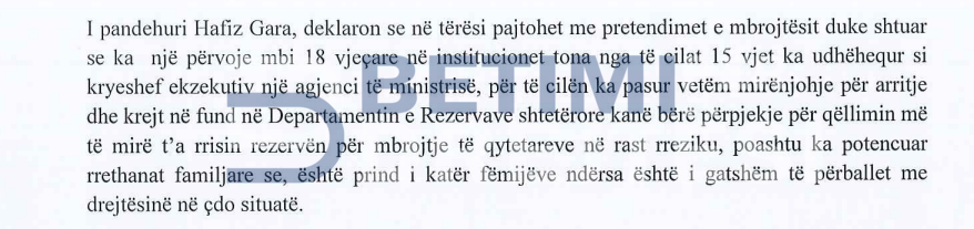 I dyshuari i dytë i Prokurorisë Speciale për aferën e rezervave shtetërore, Hafiz Gara para gjykatës në seancë dëgjimore thuhet se ka deklaruar se ka pasur si qëllim të vetëm rritjen e rezervave shtetërore në mbrojtje të qytetarëve në rast të rrezikut.