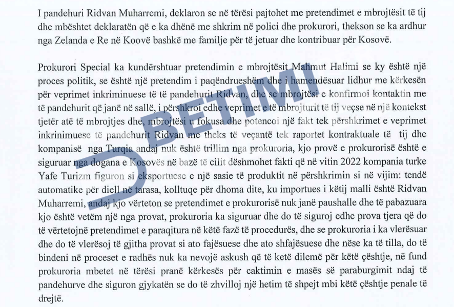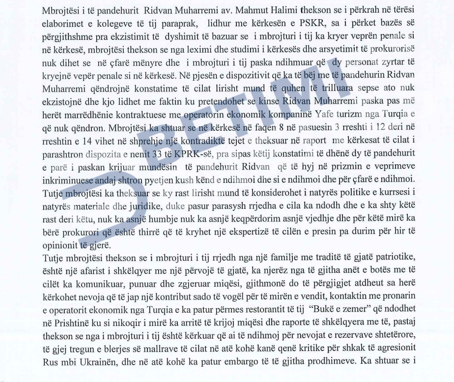 Në fund, kërkesën e Prokurorisë Speciale për caktim të masës së paraburgimit e ka kundërshtuar edhe mbrojtësi i të dyshuarit Ridvan Muharremi, avokati Mahmut Halimi, i cili sipas vendimit të Gjykatës, ka thënë se si rast i duket tërësisht politik dhe assesi i natyrës materiale dhe juridike. E kjo sipas tij, duke pasur parasysh rrjedhën që ka ndodhur e që e ka shtyrë këtë rast deri këtu, nuk ka asnjë humbje, asnjë keqpërdorim e asnjë vjedhje.