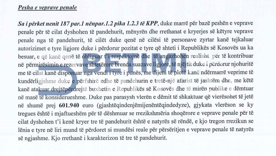 Gjithashtu, gjykata me rastin e caktimit të masës së paraburgimit ka marrë parasysh edhe peshën e veprës penale, ku dëmi i pretenduar vlerësohet të jetë 601 mijë e 940 euro.