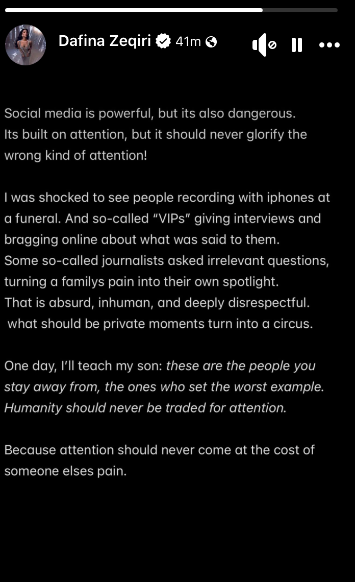 “Rrjetet sociale janë të fuqishme, por gjithashtu të rrezikshme. Janë ndërtuar mbi vëmendjen, por nuk duhet të glorifikojnë llojin e gabuar të saj. U trondita kur pashë njerëz duke xhiruar me telefona në një varrim. Dhe disa ‘VIP-a’ që jepnin intervista e mburreshin online me atë që u ishte thënë. Disa të ashtuquajtur gazetarë bënin pyetje të parëndësishme, duke e kthyer dhimbjen e një familjeje në skenë për veten e tyre. Kjo është absurde, çnjerëzore dhe thellësisht mosrespektuese. Momente që duhej të ishin private, u kthyen në një cirk,” shkroi ajo.