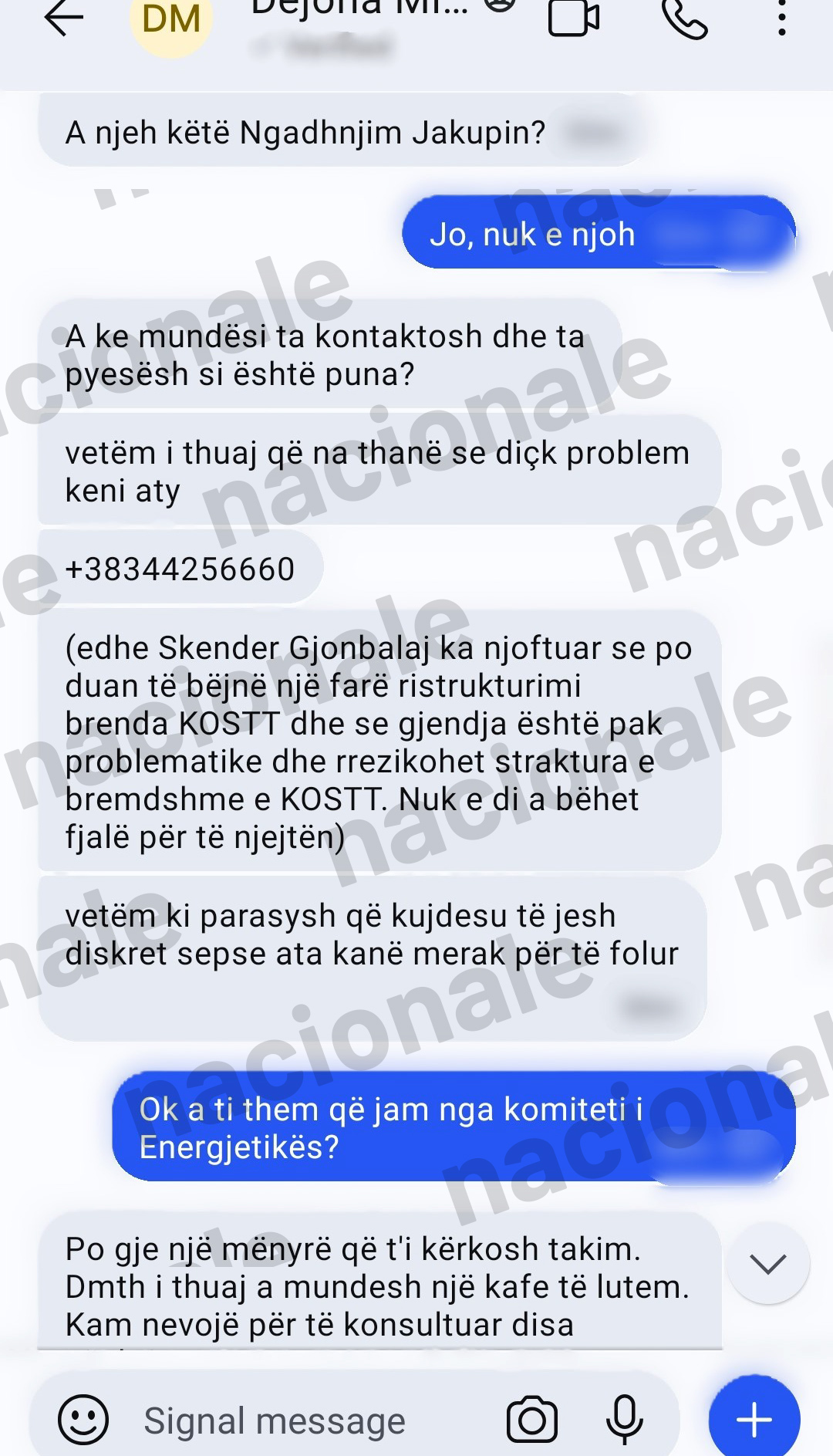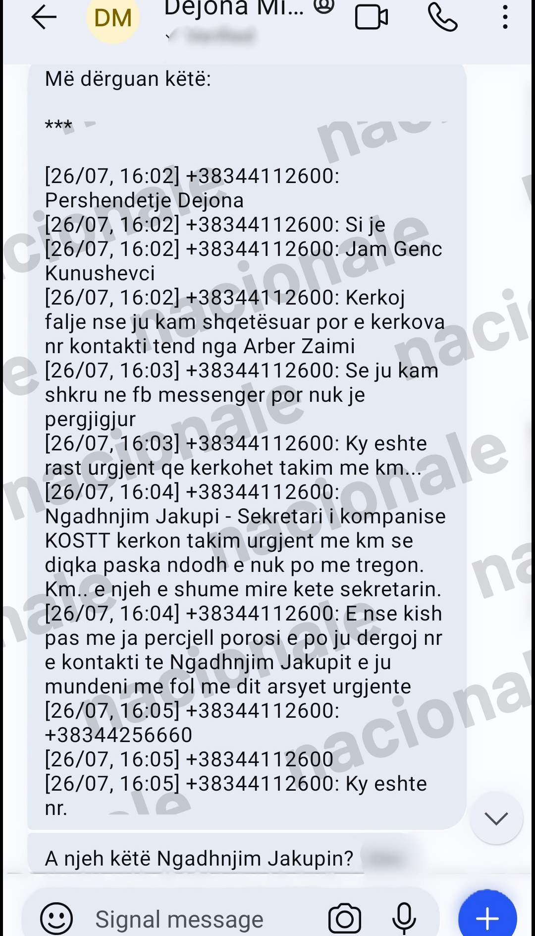 “E nëse kish pas me ja përcjell porosi e po ju dërgoj nr kontakti të Ngadhnjim Jakupit e ju mundeni me fol për arsyet urgjente”, thuhet në mesazhin të cilin Genc Kunushevci ia kishte shkruar Dejona Mihalit, e të cilin ajo ia transmeton Nagip Krasniqit. Pasi Mihali ia përcjellë këtë mesazh, e pyet ish-kryeshefin e KEK-ut, nëse e njeh Ngadhnjim Jakupin.