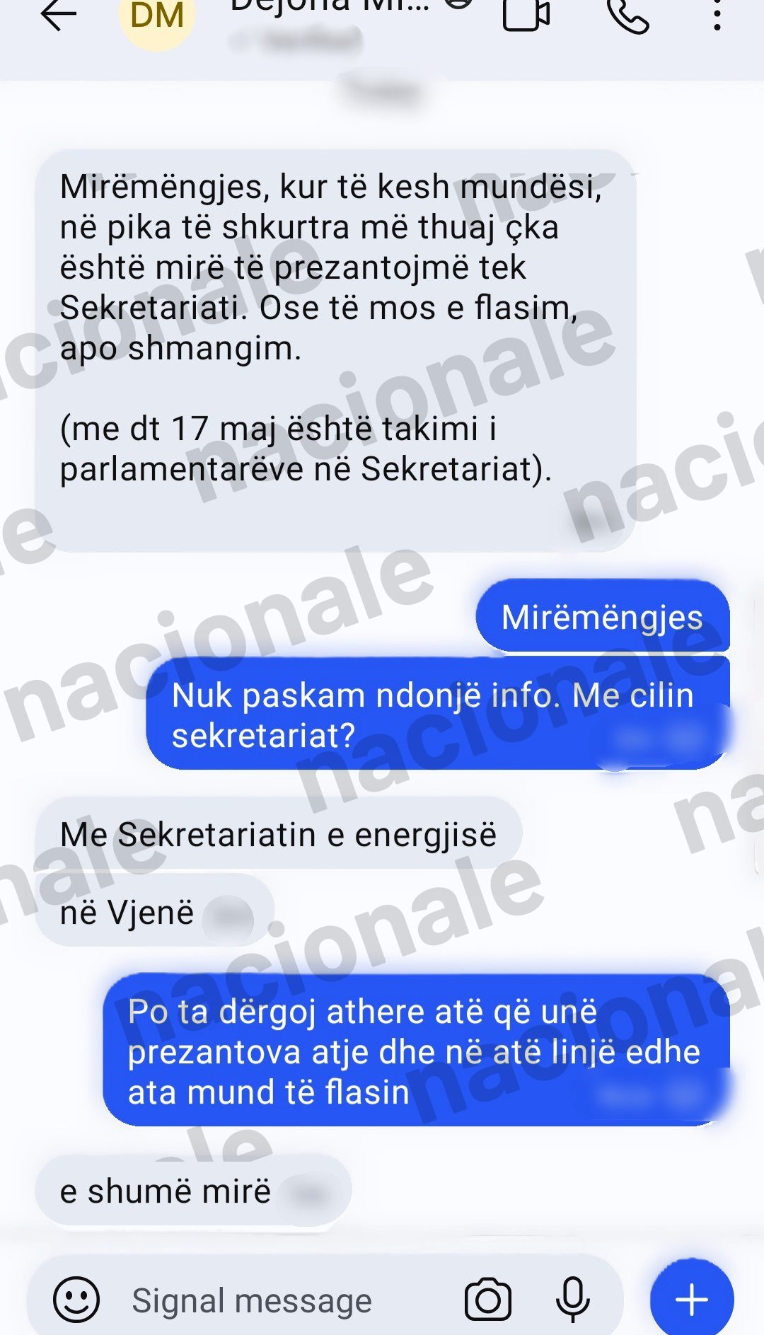 Koordinim vazhdon. Mihali në një mesazh kërkon propozime nga Nagip Krasniqi se çka të thonë në Sekretariat. “Ose të mos e flasim apo shmangim. Me dt 17 maj është takimi i parlamentarëve në Sekretariat”, thuhet në mesazhin e Dejona Mihalit.