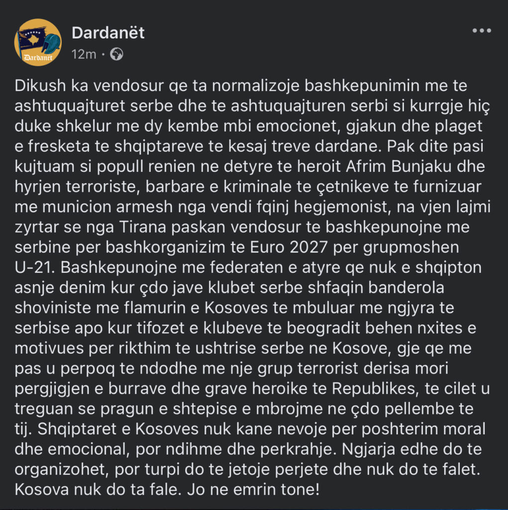 ‘Dardanët’ dalin kundër Evropianit Shqipëri-Serbi