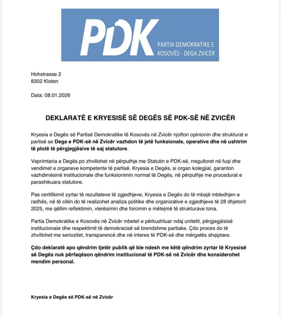 Kryesia e Degës së Partisë Demokratike të Kosovës në Zvicër njofton opinionin dhe strukturat e partisë se Dega e PDK-së në Zvicër vazhdon të jetë funksionale, operative dhe në ushtrim të plotë të përgjegjësive të saj statutore. Veprimtaria e Degës po zhvillohet në përputhje me Statutin e PDK-së, rregulloret në fuqi dhe vendimet e organeve kompetente të partisë. Kryesia e Degës, si organ kolegjial, garanton vazhdimësinë institucionale dhe funksionimin normal të Degës, në përputhje me procedurat e parashikuara statutore.