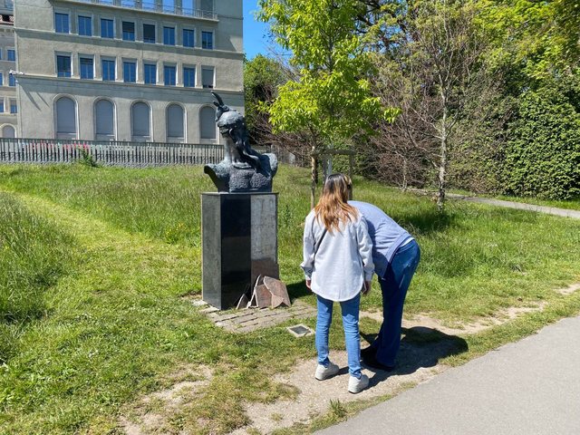 Busti i heroit kombëtar të Shqipërisë është përuruar në Gjenevë më 1 nëntor te vitit 1997 nga veprimtarët e shquar Astrit Leka dhe Zaim Jashari. Ai u vendos në Zvicër në shenjë falënderimi dhe respekti ndaj komunitetit shqiptar në territorin helvetik, numri i të cilëve besohet se është mbi 300.000.
