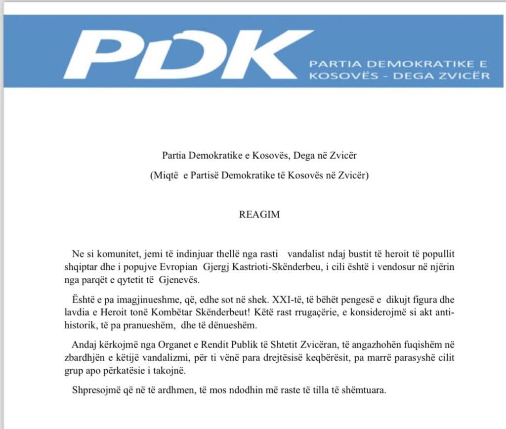 “Është e pa imagjinueshme, që, edhe sot në shek. XXI-të, të bëhët pengesë e dikujt figura dhe lavdia e Heroit tonë Kombëtar Skënderbeut! Këtë rast rrugaçërie, e konsiderojmë si akt anti-historik, të pa pranueshëm, dhe të dënueshëm. Andaj kërkojmë nga Organet e Rendit Publik të Shtetit Zvicëran, të angazhohën fuqishëm në zbardhjën e këtijë vandalizmi, për ti vënë para drejtësisë keqbërësit, pa marrë parasyshë cilit grup apo përkatësie i takojnë.”, shkruan ndër tjera në reagimin e PDK-së.