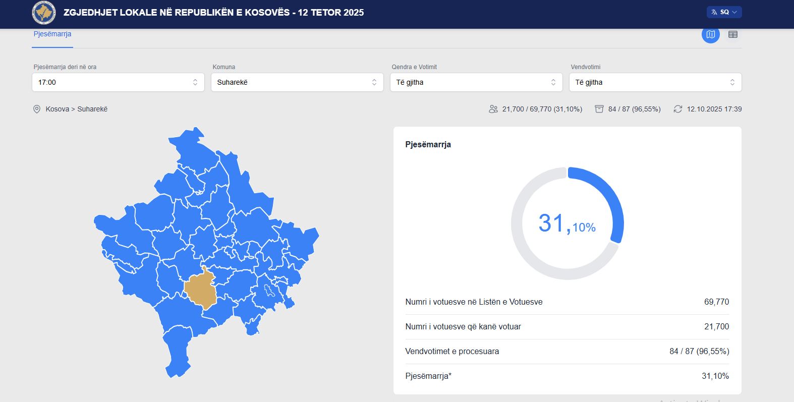 Deri në ora 17:00, në këtë komunë kanë votuar 21.700 qytetarë apo 31.10 për qind.