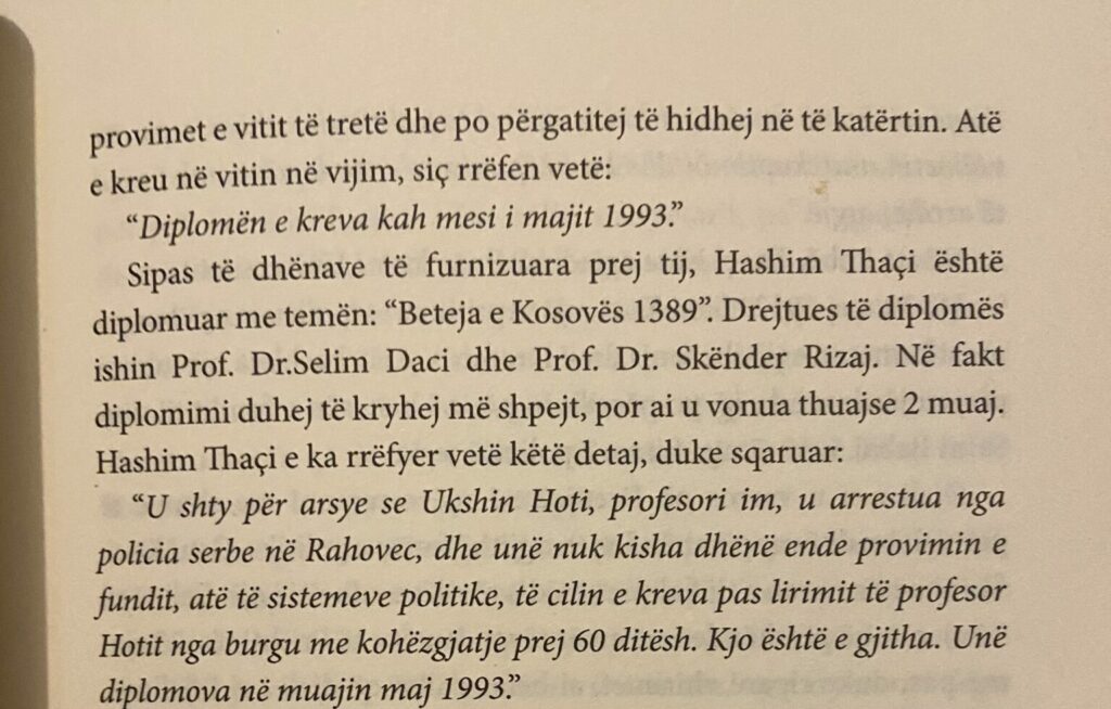 Në libër thuhet se “Hashim Thaçi është diplomuar me temën: “Beteja e Kosovës 1389″. Drejtues të diplomës ishin: Prof. Dr. Selim Daci dhe Prof. Dr. Skënder Rizaj. Në fakt diplomimi duhej të kryhej më shpejt, por ai u vonua thuajse 2 muaj”.