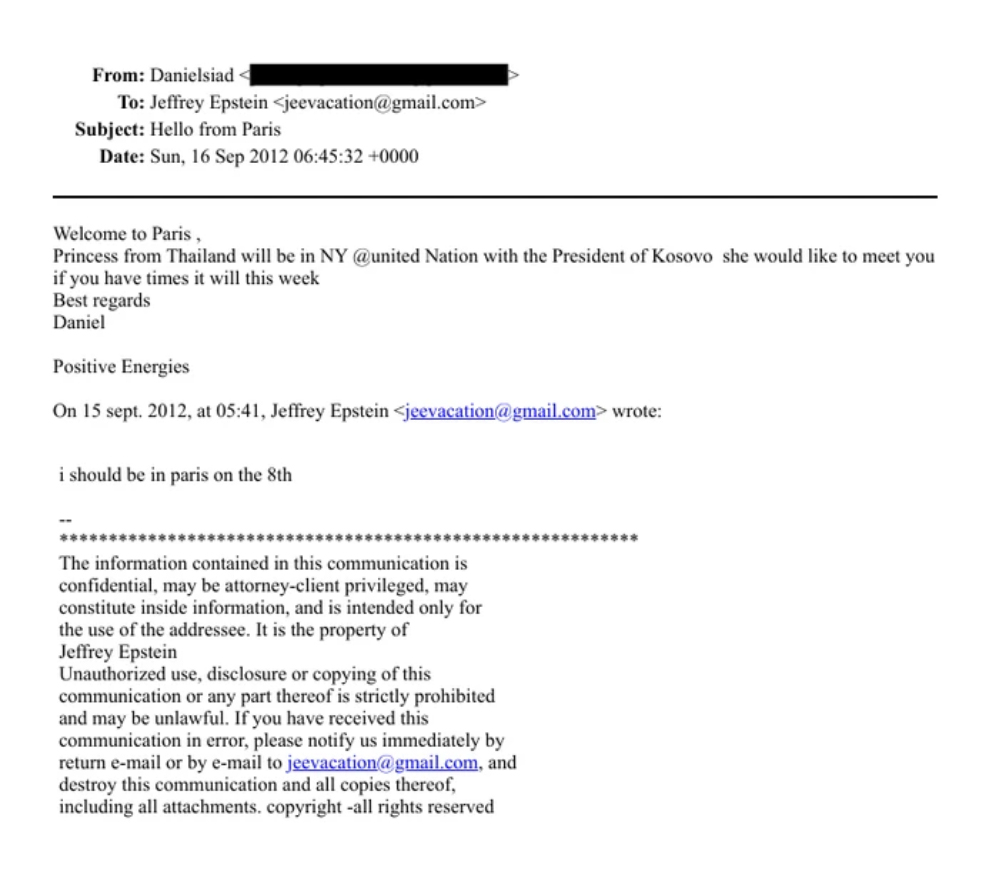 “Mirë se vini në Paris, Princesha nga Tajlanda do të jetë në New York, Kombet e Bashkuara, me presidenten e Kosovës. Ajo do të donte të ju takonte nëse keni kohë këtë javë.