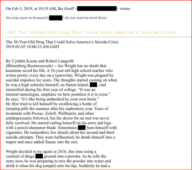 Në një email që mban titullin: Ilaçi 50-vjeçar që mund të zgjidhë krizën e vetëvrasjeve në Amerikë, të dërguar me datë 5 shkurt 2019-të, me emër dërguesi dhe marrësi të censuruar, thuhet se nga Maqedonia kanë mbërritur në SHBA rreth 1000 tru njerëzish, disa prej tyre nga persona që kanë kryer vetëvrasje.