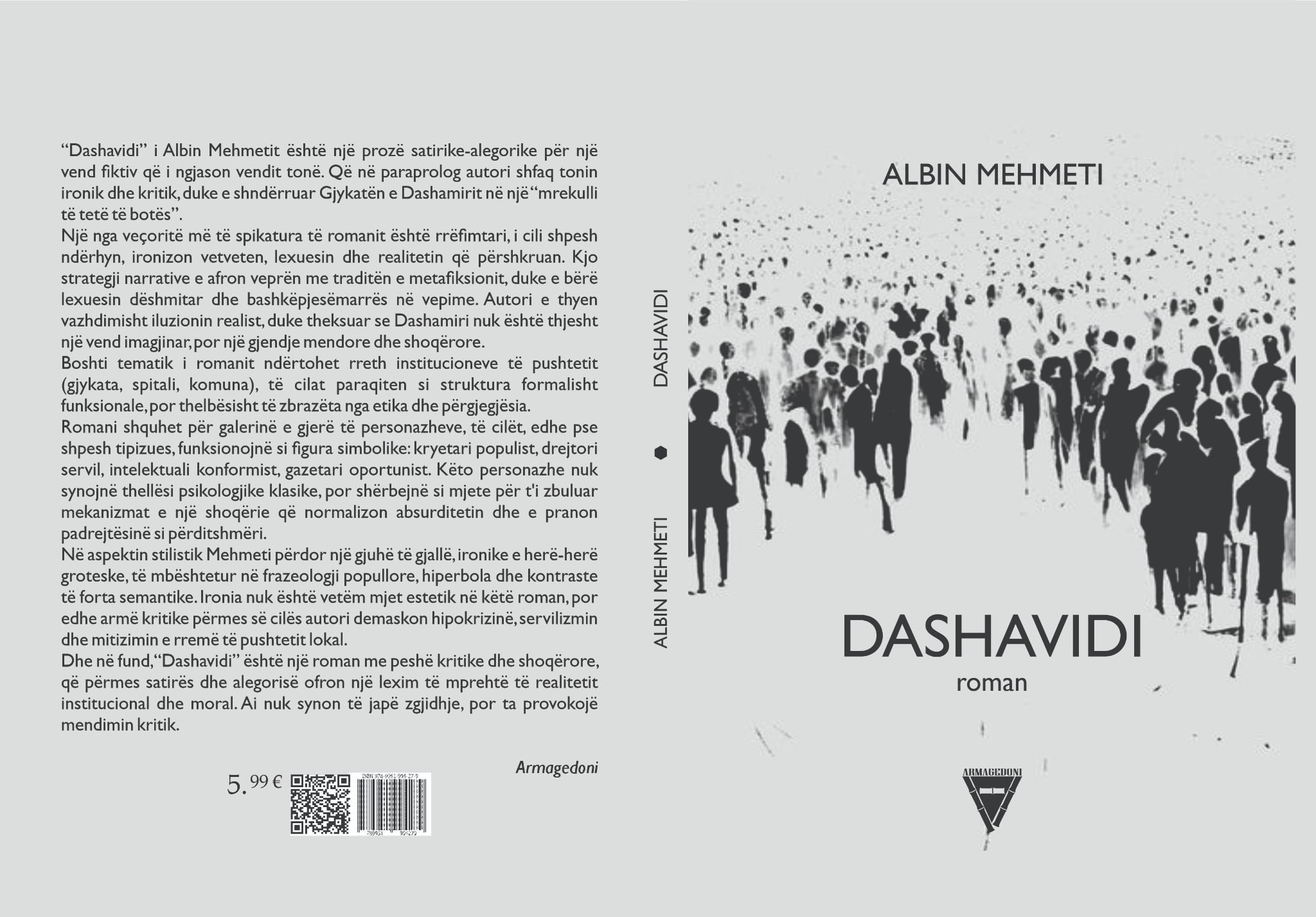 Shkrimtarit Albin Mehmeti, nga shtëpia botuese “Armagedoni”, sot i është botuar një vepër e re. Bëhet fjalë për romanin “Dashavidi”, i cili, sipas botuesit, Berat Armagedoni, është një prozë satirike-alegorike për një vend fiktiv që i ngjason vendit tonë. Që në paraprolog autori shfaq tonin ironik dhe kritik, duke e shndërruar Gjykatën e Dashamirit në një “mrekulli të tetë të botës”.
