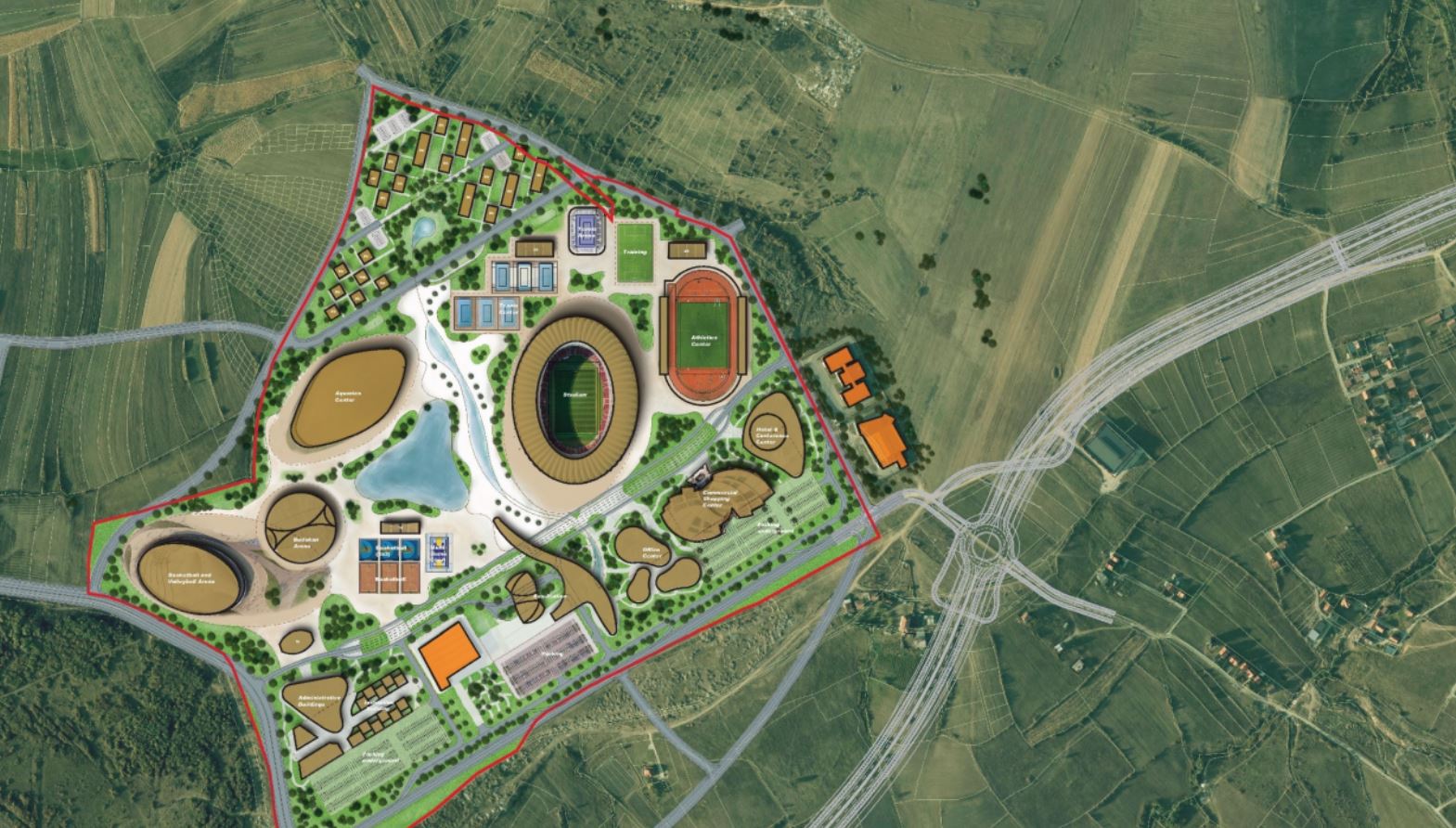 Kompleksi do të ndërtohet në 60 hektarë dhe përveç hapësirave sportive do t’i ketë të gjitha ambientet tjera shoqëruese, përfshirë hapësirat administrative, komerciale dhe një stacion të autobusëve.