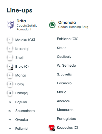 Janë publikuar formacionet zyrtare të ndeshjes mes Dritës dhe Omonias.