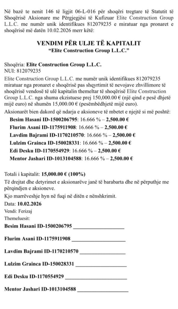“Elite Construction Group” – njoftim për zvogëlim kapitali, 26.02.2026