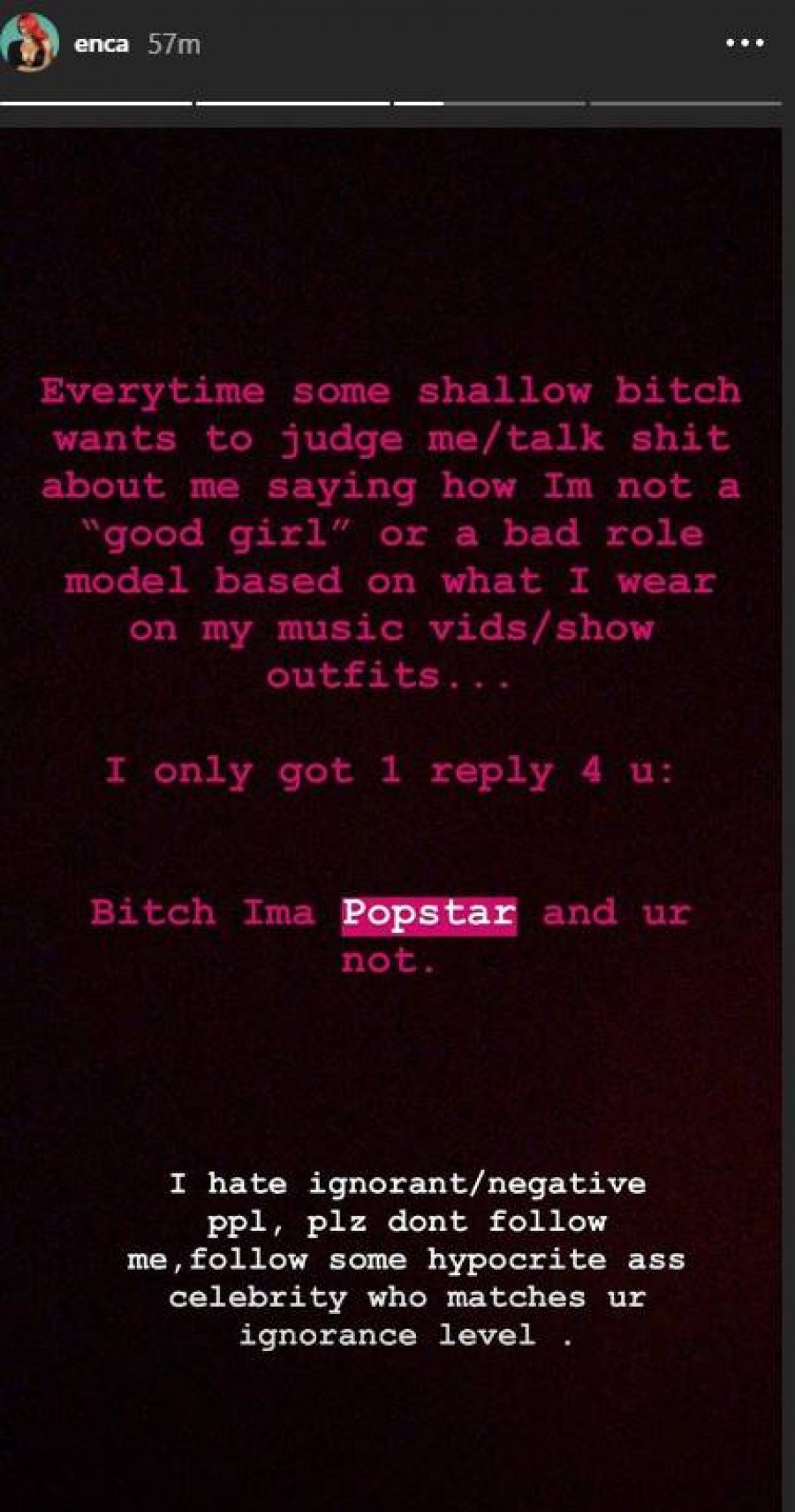 “Çdo herë që një k*****më drejtohet me budallallëqe për mua, duke thënë se nuk jam një “vajzë e mirë” dhe një model për tu ndjekur duke u bazuar në veshjet apo videot e mia muzikore unë kam një përgjigje për ju: K**** unë jam një yll popi dhe ti nuk je. I urrej njerëzit hipokritë, ju lutem mos më ndiqni” shkruan ajo krahas fotos.