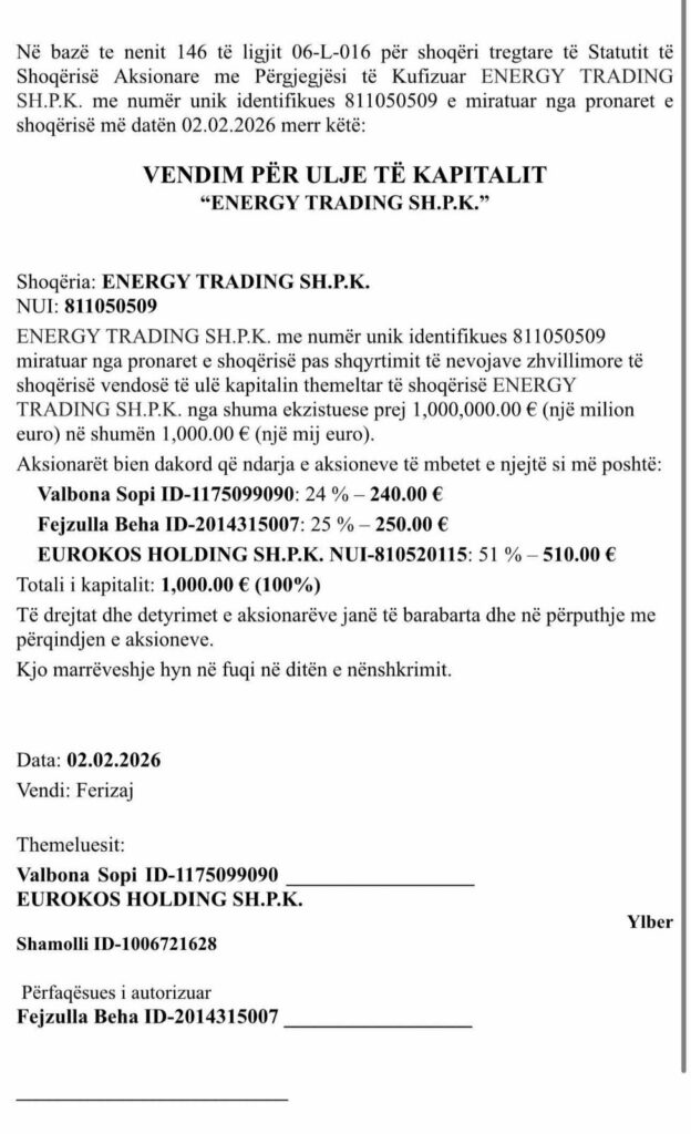 “Energy trading” – vendim për zvogëlim kapitali, 26.02.2026 26 shkurt 2026 | 12:27 Lajme të sponsorizuara Të Fundit 26 shkurt12:27 “Energy trading” – vendim për zvogëlim kapitali, 26.02.2026 26 shkurt12:25 “Elite Construction Group” – njoftim për zvogëlim kapitali, 26.02.2026 26 shkurt12:21 Kompania “AFA Sport Center” – likuidim, 26.02.2026 26 shkurt11:28 Shpallje nga Kristina Skender Kolgjeraj 26 shkurt09:59 Shpallje e pavlefshme nga Gafurr Elshani B.I 25 shkurt16:19 Shpallje nga Flamurtar Ukaj B.I.