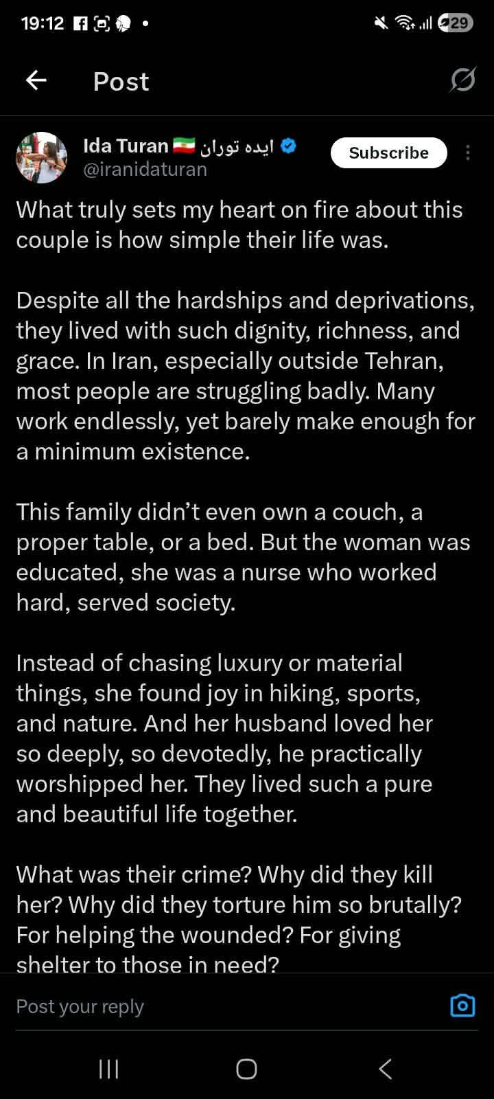 Në Iran, veçanërisht jashtë Teheranit, shumica e njerëzve po luftojnë shumë. Shumë punojnë pafundësisht, por mezi sigurojnë mjaftueshëm për një ekzistencë minimale. Kjo familje nuk kishte as një divan, një tavolinë të mirëfilltë apo një shtrat. Por gruaja ishte e arsimuar, ishte një infermiere që punonte shumë, i shërbente shoqërisë.