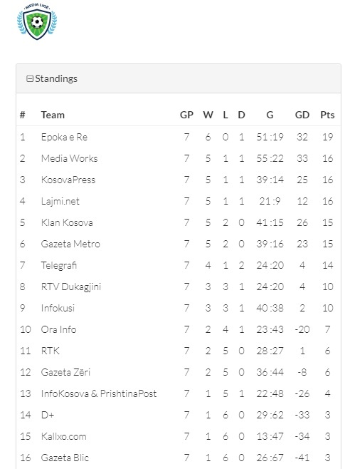 Ekipi i gazetës “Epoka e re” po vazhdon dominimin në Media Ligë, pasi nga shtatë ndeshjet e zhvilluara ka regjistruar gjashtë fitore dhe një barazim.