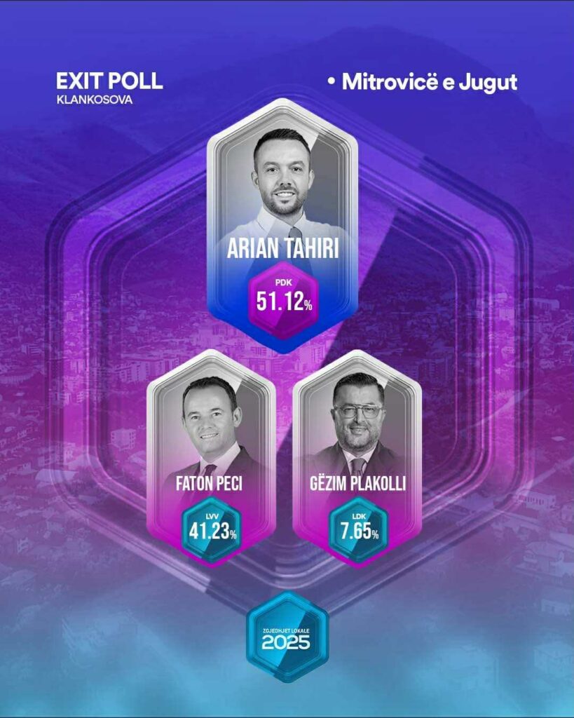 Exit Poll-i në Mitrovicë: Arian Tahiri, 51.12%, Faton Peci 41.23%, Gëzim Plakolli 7.65%