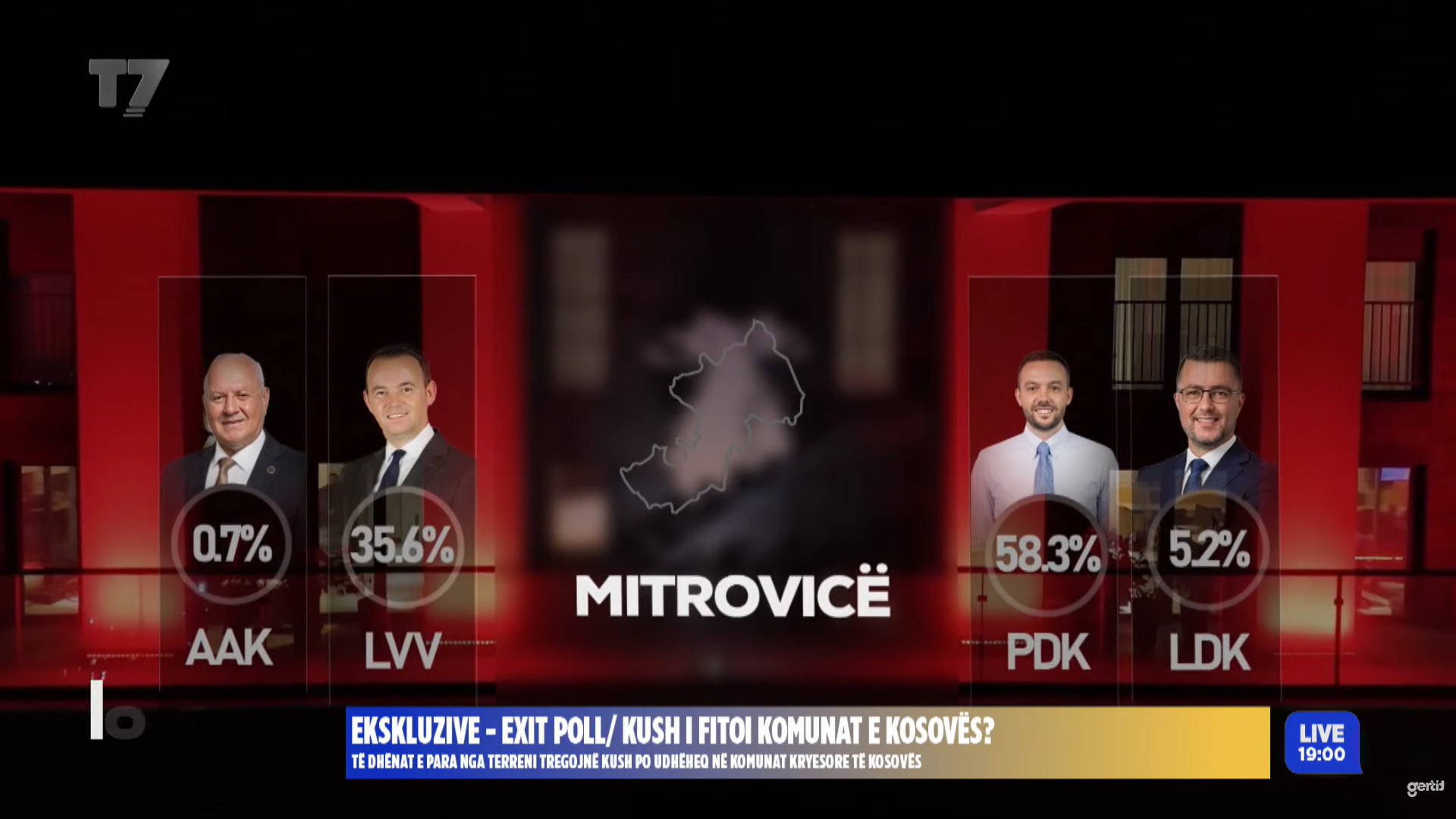 Exit Poll në T7: Arian Tahiri i PDK-së fiton bindshëm Mitrovicën ndaj Faton Pecit