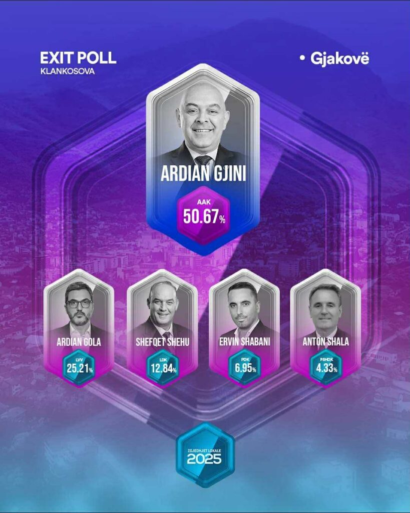 Exit-Polli i Klan Kosova, në bashkëpunim me PIPOS, ka projektuar Ardian Gjinin, kandidat i AAK-së për kryetar të komunës së Gjakovës, fitues qysh në raundin e parë.