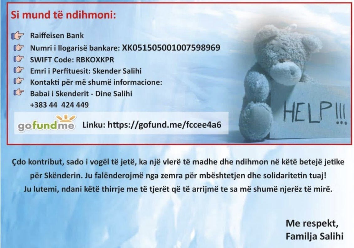 Lutemi që të gjithe ata që kanë mundësi, të kontribuojnë për ta ndihmuar Skënderin të marrë trajtimin e nevojshëm dhe të ketë një shans për t’u shëruar.