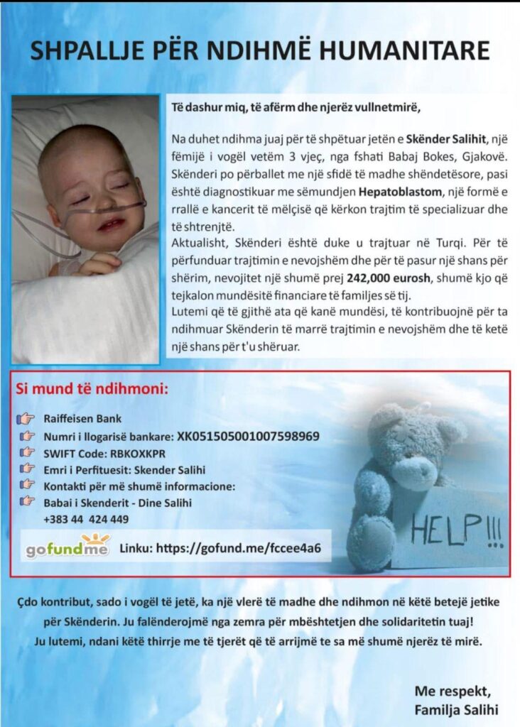 Na duhet ndihma juaj për të shpëtuar jetën e Skënder Salihit, një femijë i vogël vetëm 3 vjeç, nga fshati Babaj Bokes, Gjakovë.